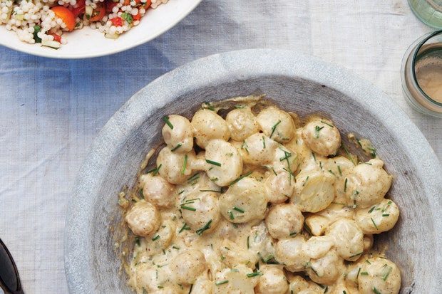Большой шумовкой переложите вареный картофель на разделочную доску для охлаждения. Отмерьте и зарезервируйте 1 1/2 стакана кулинарной жидкости для последующего использования. Остывший сладкий картофель нарезать кружочками, сделав их как можно тоньше, не ломая.
