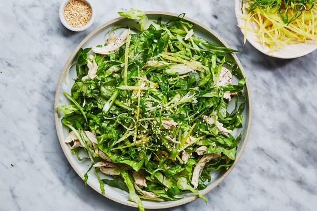 Нагрейте оставшуюся 1 столовую ложку виноградного масла в зарезервированной сковороде на среднем огне. Готовьте белую и бледно-зеленую части зеленого лука, чеснок и имбирь, помешивая, пока они не станут мягкими, но не подрумянятся, около 1 минуты.