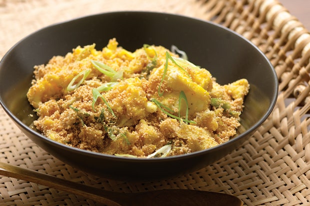 Взбейте яйца, соль, разрыхлитель, перец и куркуму в большой миске. С помощью резиновой лопатки смешайте луковую смесь, кинзу, укроп, петрушку и пажитник. (Яичная смесь должна выглядеть густой и очень зеленой.)