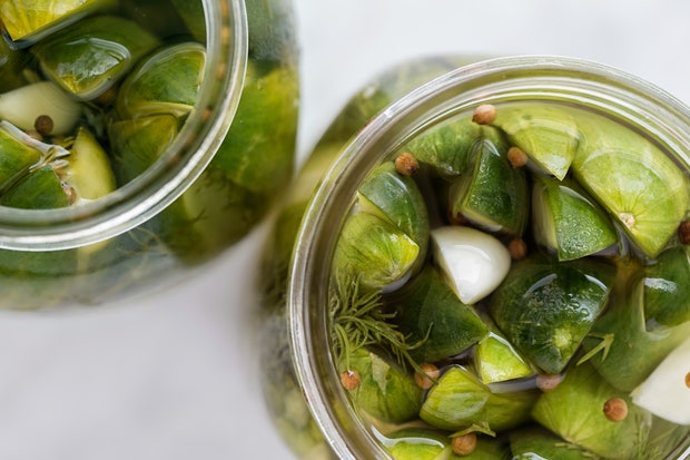 Переложите кабачковые ленты на тарелку. Добавьте растительное масло в заправку и взбейте венчиком. Руками помассируйте капусту в соусе до темно-зеленого цвета. Верните сквош-ленты в миску и перемешайте.