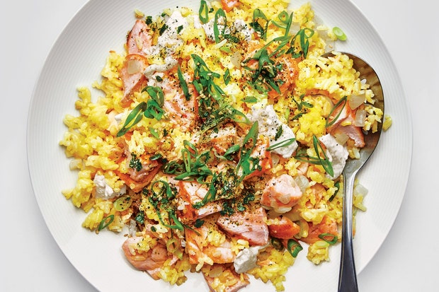 Нагреть 1 Ст. Л. масло в той же сковороде на среднем огне. Добавьте лук, 1/4 ч. л. соли и 1/4 ч. л. перца и готовьте, периодически помешивая, до мягкости и прозрачности, около 5 минут. Добавьте чеснок и готовьте, постоянно помешивая, до появления аромата, 1 минуту. Добавить спаржу и варить, периодически помешивая, до хрустящей корочки-нежной и ярко-зеленой, еще 3-5 минут. Добавьте овощную смесь к свиной смеси, перемешайте и дайте немного остыть. Вытрите сковороду и резерв.