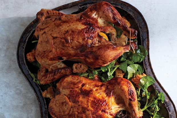 4. выпекайте, часто поливая соком сковороды, пока кусочки бедра не дадут прозрачный желтый (а не розовый) сок, когда их колоть вилкой, от 50 минут до 1 часа.