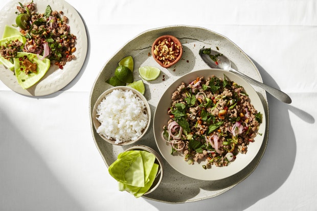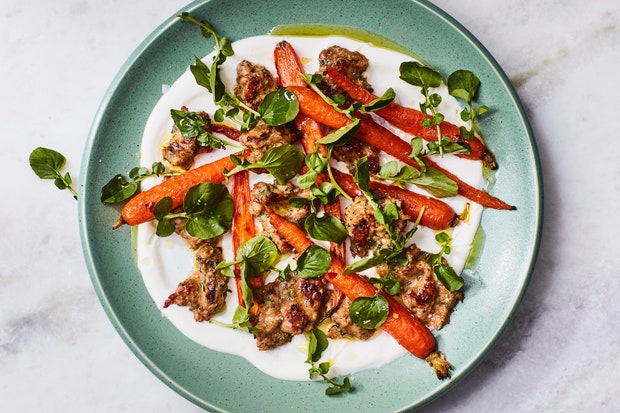 Если вы используете свежий горошек, готовьте в той же сковороде на среднем огне до мягкости и ярко-зеленого цвета, около 3 минут. Если вы используете замороженные продукты, готовьте только до тех пор, пока они не прогреются, около 1 минуты. Добавьте мяту, при необходимости посолите. Разложите овощи и курицу в большой неглубокой миске или на блюде.