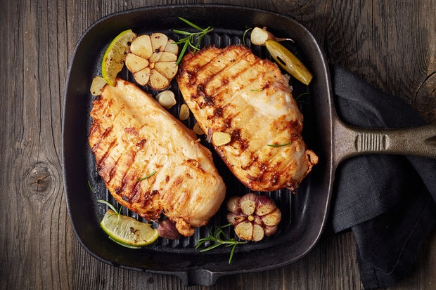 Цыплят вымыть, обсушить. Начиная с конца шеи, скользите пальцами под кожу груди. Положите по 2 веточки розмарина и несколько ломтиков чеснока на каждую половину грудки. Натрите снаружи каждую курицу 1 чайной ложкой морской соли и 1/2 чайной ложки перца. Сложите кончики крыльев под собой; свяжите ноги вместе. Завернуть в пластик, охладить 4 часа.