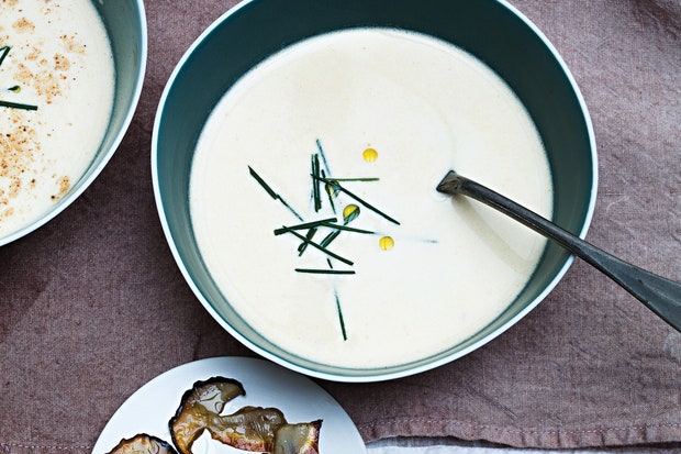 При работающем двигателе бросьте чеснок в кухонный комбайн и мелко нарежьте. Добавьте оставшиеся ингредиенты соуса и 1/2 чайной ложки соли и пульсируйте, пока зелень не станет мелко нарезанной. Переложить в миску.