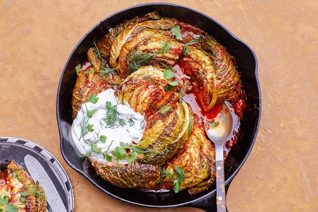 Смешайте лук, болгарский перец, тмин, чесночный порошок и халапеньо (если вы его используете) в большой сковороде для обжаривания. Добавьте 1/2 стакана воды и обжарьте овощи на среднем огне около 10 минут, пока они не станут мягкими, периодически помешивая и добавляя еще 1-2 столовые ложки воды по мере необходимости, чтобы овощи не прилипали к сковороде. Добавьте капусту, рис, фасоль и 1 стакан воды и варите на среднем огне в течение 3-5 минут, складывая ингредиенты, пока капуста не завянет и жидкость не впитается.