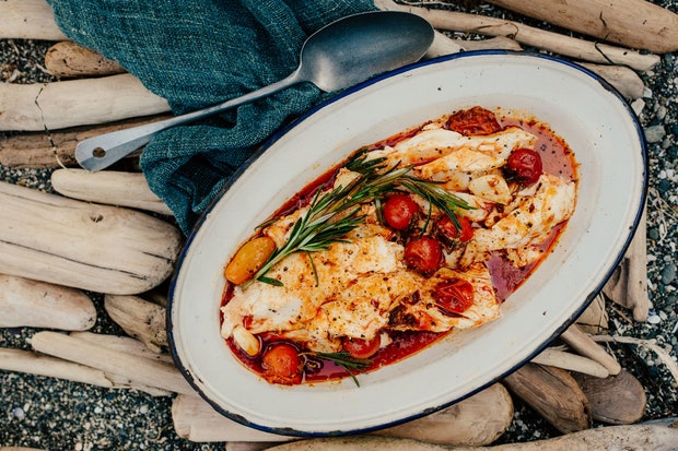 Палтус на гриле с помидорами и пальмовыми сердцами