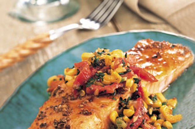 Жареный лосось с красным перцем и кукурузным соусом