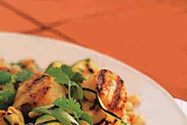 Жареные гребешки, кабачки и зеленый лук с белой фасолью