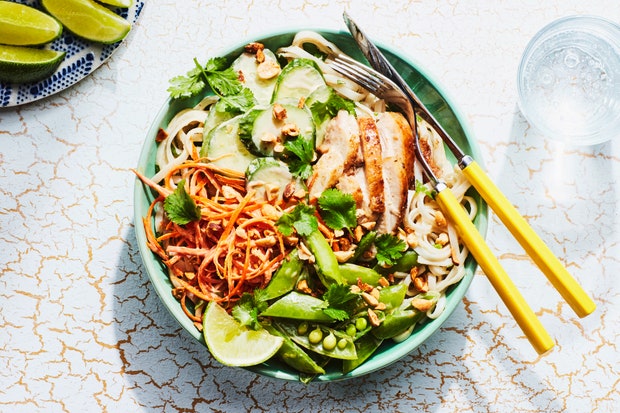 Рисовая лапша с арахисовым соусом, курицей и зеленым горошком