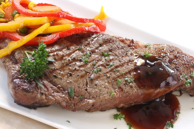 Сверху филейный стейк с болгарским перцем и обжаренным луком