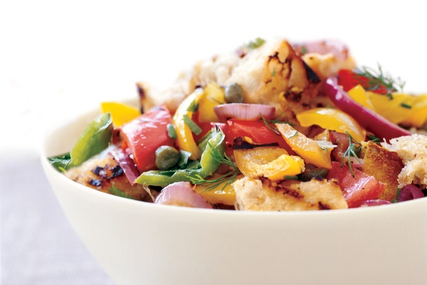 Салат Панцанелла на гриле с болгарским перцем, летним кабачком и помидорами