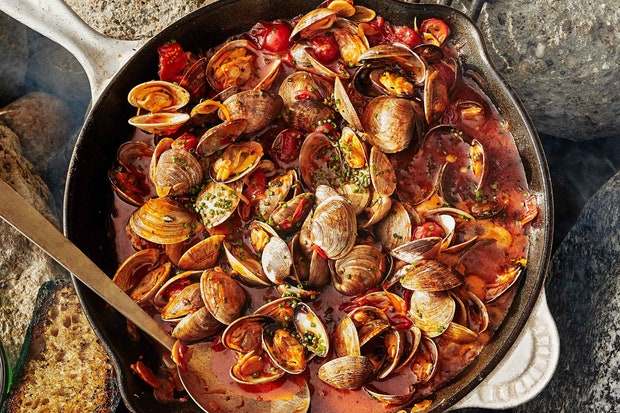Моллюски с чоризо, луком-пореем, помидорами и белым вином