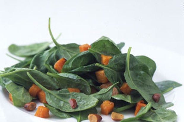 Салат из жареных тыквенных орехов и шпината с поджаренной миндальной заправкой