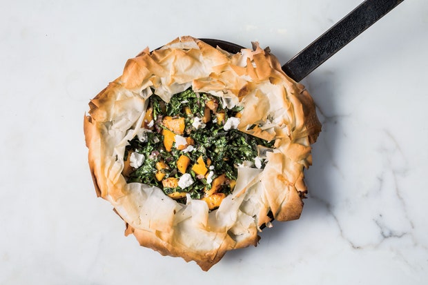 Пирог Филло на сковороде с тыквой, капустой и козьим сыром