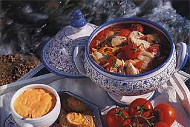Рыбный суп с помидорами и соусом из красного перца и чеснока