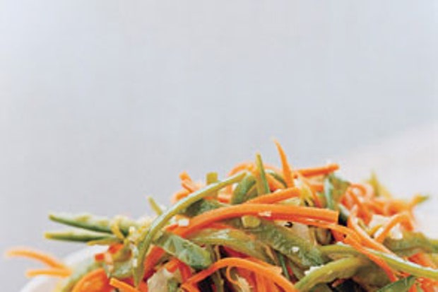 Морковь, снежный горошек и красный перец Жульен в медовом винегрете