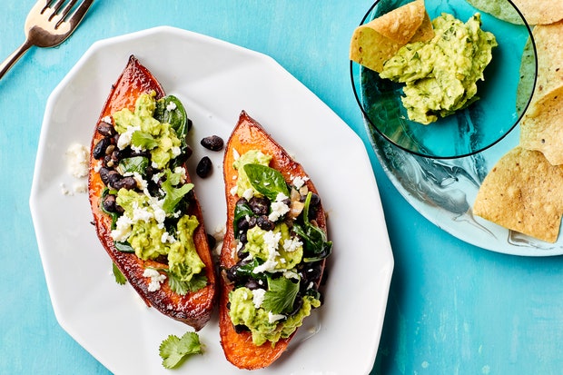 Фаршированный сладкий картофель с фасолью и гуакамоле