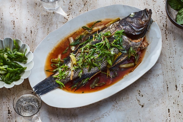 Черный морской окунь с кисло-сладким апельсиновым соусом из ревеня