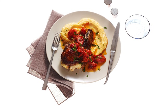 Моцарелла-фаршированные свиные отбивные с полентой и помидорами