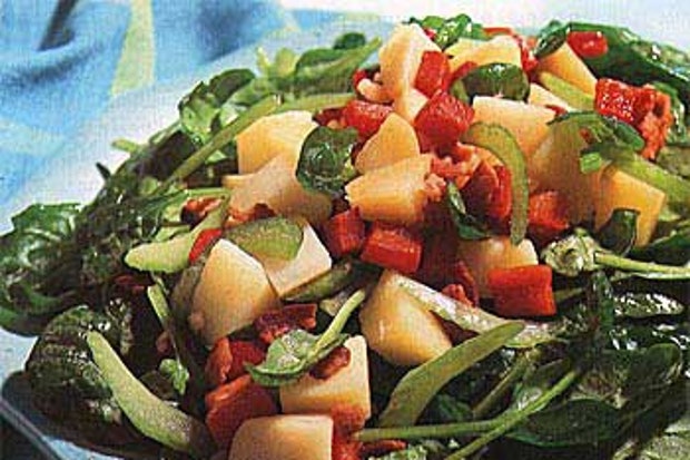 Салат из картофеля, шпината и красного болгарского перца с теплым беконным винегретом