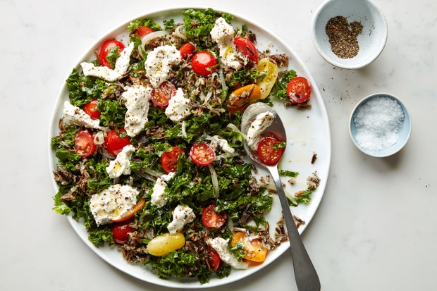 Натертая капуста с помидорами, моцареллой в сливках и диким рисом