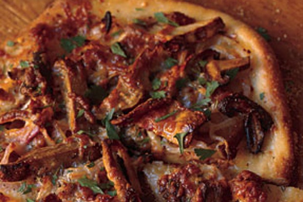 Пицца с колбасой, красным луком и дикими грибами
