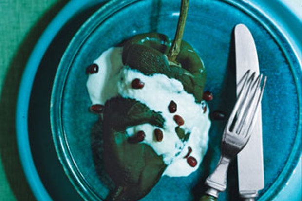 Фаршированный Чили Поблано с ореховым соусом и зернами граната