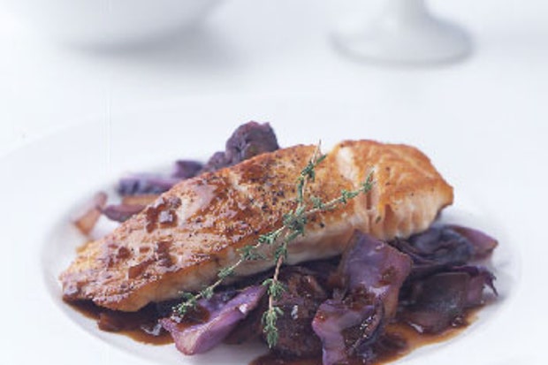Обжаренный на сковороде лосось с красной капустой и луком с Мерло Гастриком