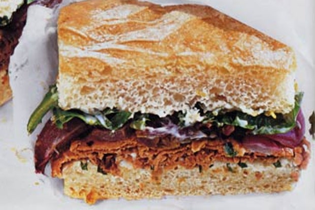 Бутерброды с ростбифом с лимонно-базиликовым майонезом и жареным красным луком