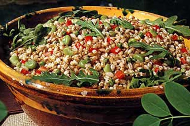 Салат фарро с горошком, Фавасом, рукколой и помидорами