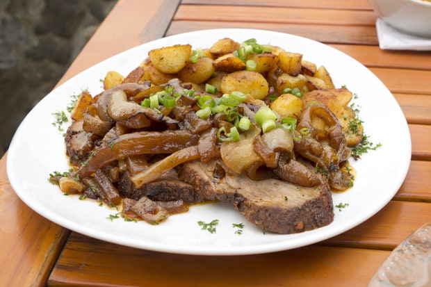 Сосиски и свиные отбивные, запеченные с фруктовой квашеной капустой