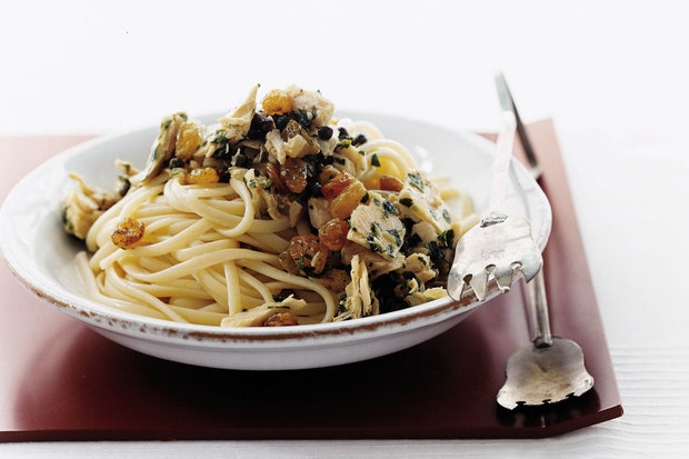 Лингвини с тунцом, каперсами и изюмом