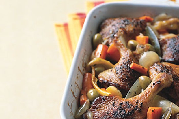 Натертые специями утиные ножки, тушеные с зелеными оливками и морковью