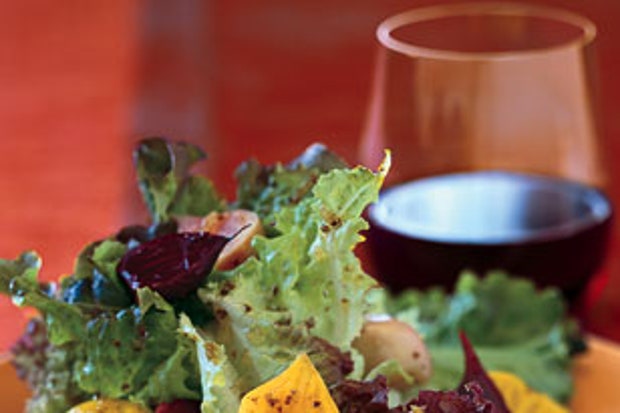Жареная свекла и детская зелень с винегретом Коринадер и песто из кинзы
