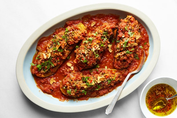 Фаршированные баклажаны и кабачки в густом томатном соусе (Baatingan w Kusaa Bil Banadoura)